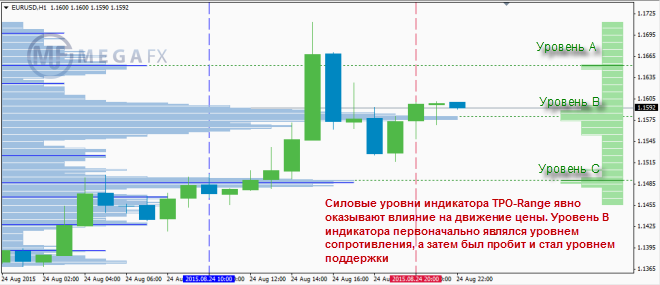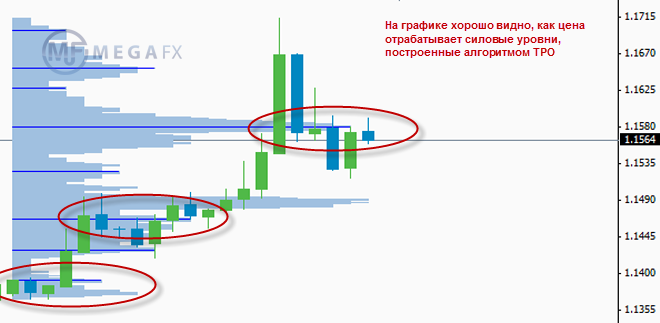 Распределение сделок по ценовым уровням на заданном временном участке. Показывается в виде гистограммы. Ширина гистограммы на данном уровне означает, условно, количество сделок, проведенных на ней. Если брокер предоставляет данные по реальному объёму, индикатор может показывать распределение и по нему.