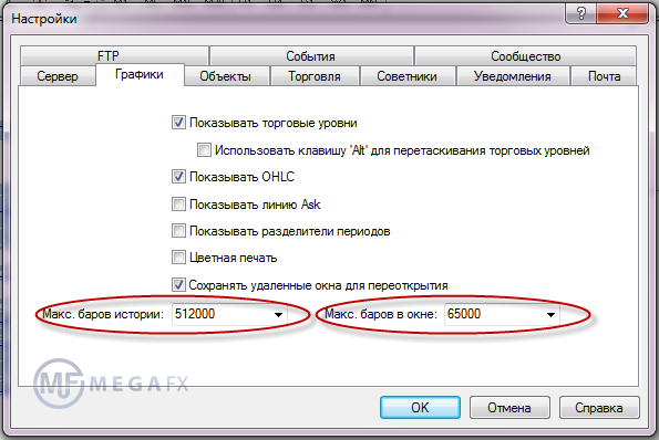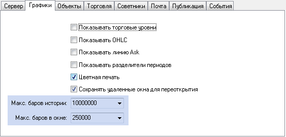 После изменения параметров необходимо перезапустить терминал. При большом значении максимума баров в окне терминал может заметно тормозить и требовать большого объема памяти даже без индикаторов. Далеко не каждый дилинговый центр предоставляет глубокую историю по графикам, это нужно учитывать.