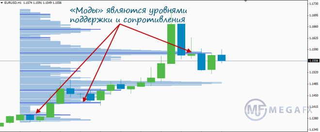 Максимумы распределений (моды) обычно используются как уровни поддержки и сопротивления. При определении хорошего уровня поиск максимальной моды особого смысла не имеет, так как имеется "проблема затенения", когда следующее скопление цен сильно влияет на предыдущее, иногда полностью скрывая его, и наоборот. Необходимо внимательно изучать график и уточнять уровни, построив распределения на интересных участках с помощью VP-Range. Распределения по большему временному диапазону, возможно, имеют больший вес.