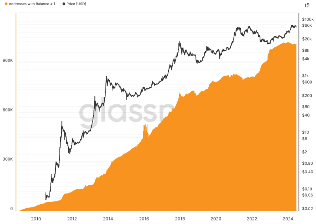 Компания Glassnode установила, что число адресов в сети с балансом не менее 1 BTC превысило 1 млн. Впервые этот рубеж был достигнут 13 мая 2023 года, когда биткоин торговался на уровне $27 000.