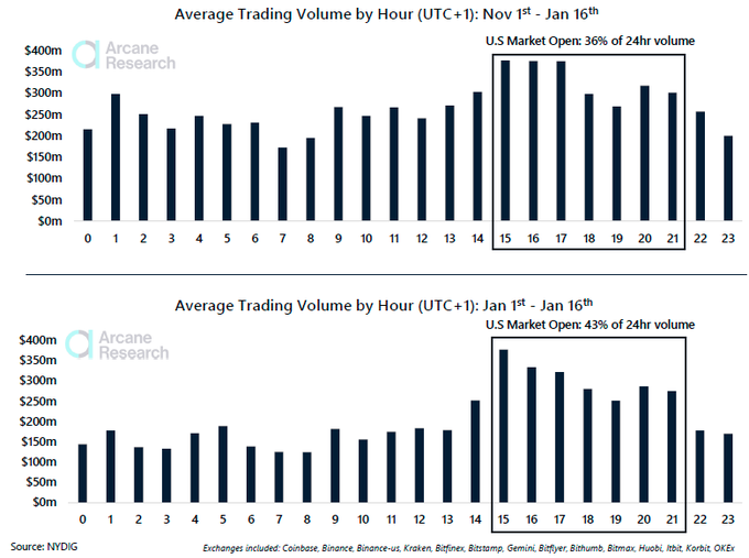 По данным компании Arcane Research, с начала января около 43% сделок с биткоином совершили трейдеры из США.