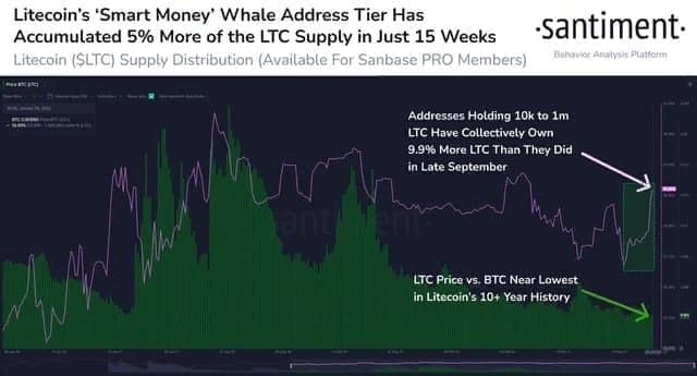 Масштабный откат, который демонстрировал лайткоин на протяжении последних нескольких месяцев, не напугал китов. Напротив, именно эта категория инвесторов скупает криптовалюту 15 недель подряд, говорится в отчете команды Santiment.