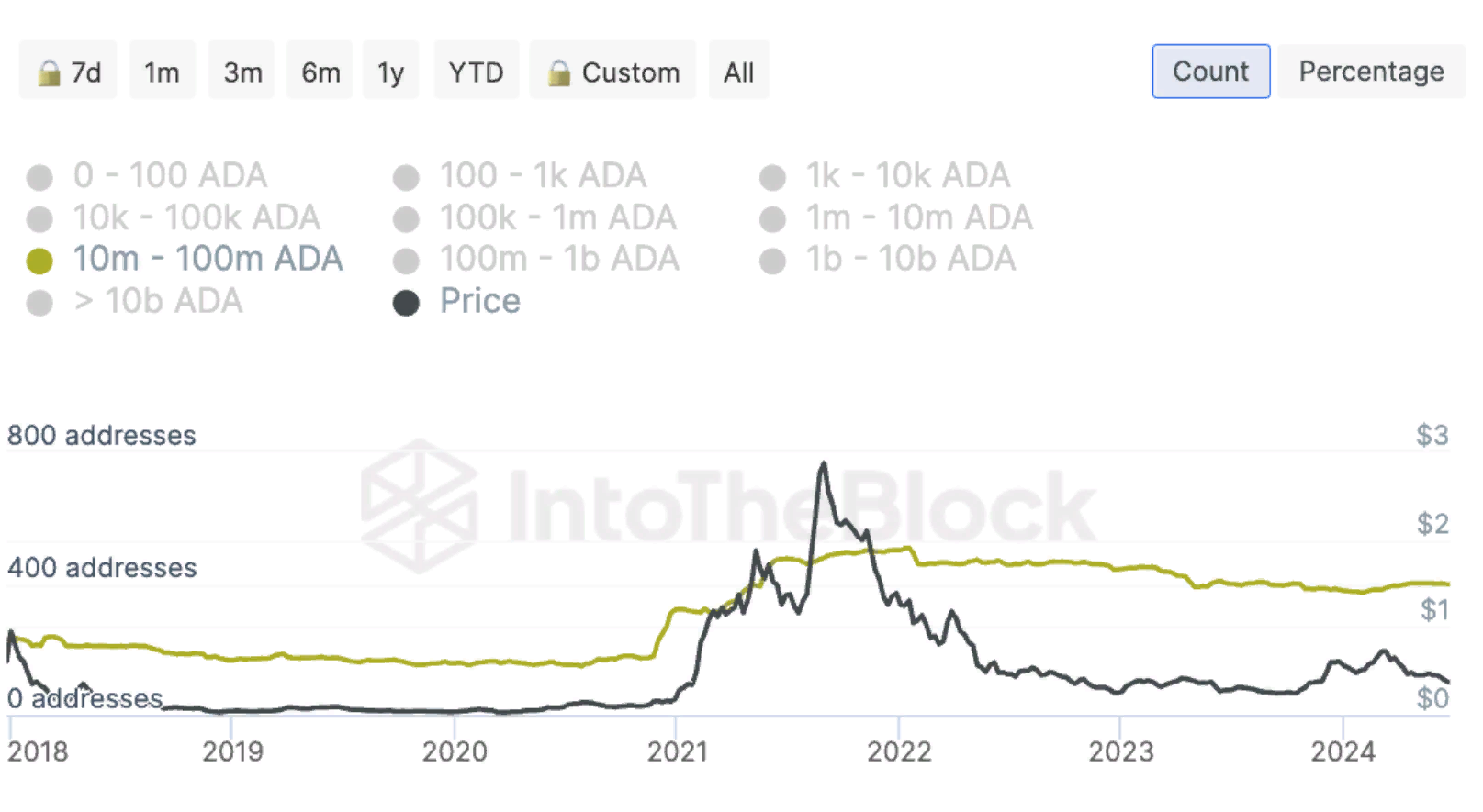 Средние группы инвесторов, контролирующих от 10 до 100 млн ADA, покупают криптовалюту с февраля 2024 года. За полгода число таких кошельков в сети возросло с 356 до 400, отметили аналитики IntoTheBlock.