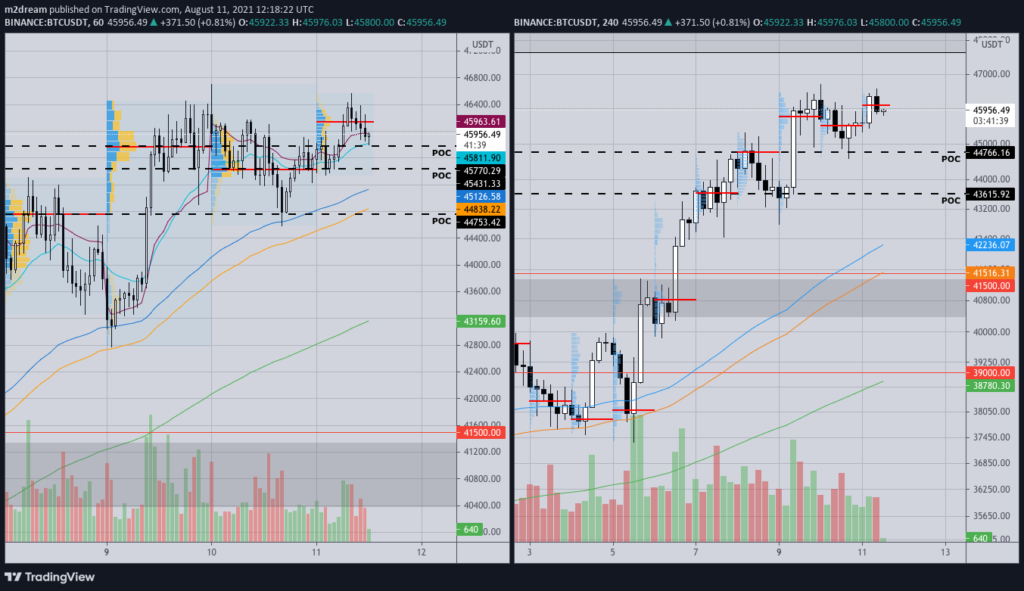 На 4-часовом и часовом графиках цене тяжело преодолеть $46 400, продавцы удерживают отметку уже в течение трех дней.