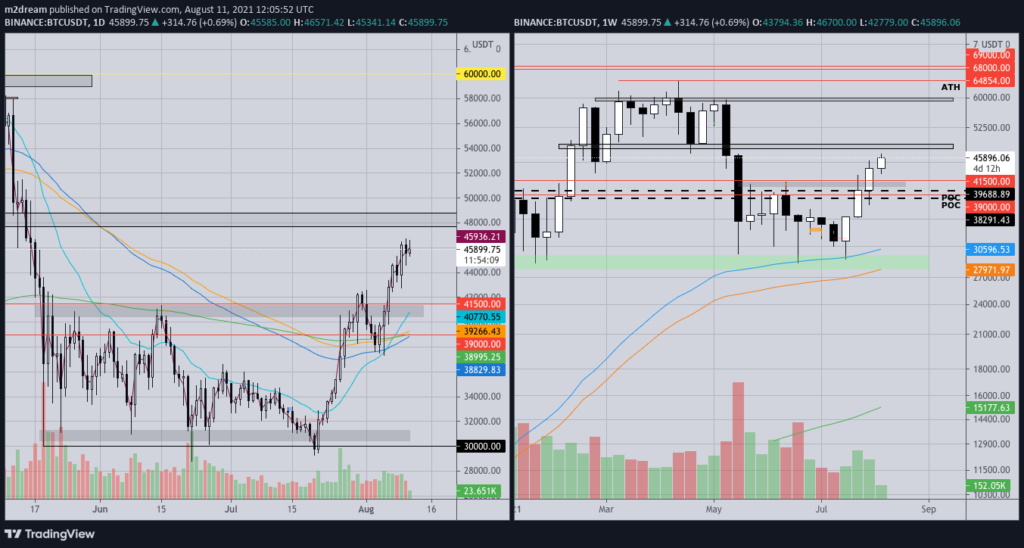 Дневной и недельный графики BTC/USDT биржи Binance от TradingView.