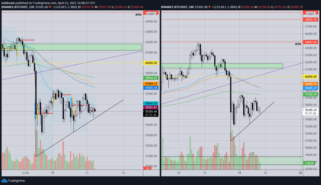На 2- и 4-часовых графиках картина еще более напряженная, цену удерживают выше локальной трендовой и зажимают с возможным выходом в любом направлении. Пока откупают, но сегодня-завтра закрепиться выше POC понедельника — $57 000 — крайне важно. Техническая картина выглядит медвежьей.