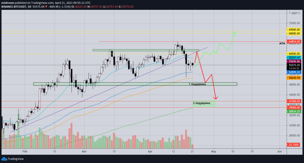 Один из самых очевидных сценариев снижения — ретест отметки $60 000 с последующим обновлением минимумов. Уже сейчас просматриваются уровни поддержки для таких сценариев — $47 500-$48 500 и $41 500-$39 000 (если цена не удержится на первом рубеже).