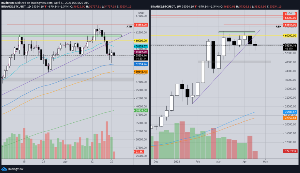 Прошлую неделю биткоин закрыл выше отметки в $56 000, пробив восходящую трендовую и уровень поддержки. На дневном графике котировки дошли до экспоненциальных средних на $52 000-$51 000, откуда падение активно откупили. Но вероятность снижения остается, если покупателям не удастся закрепиться выше $58 000 в ближайшие дни.