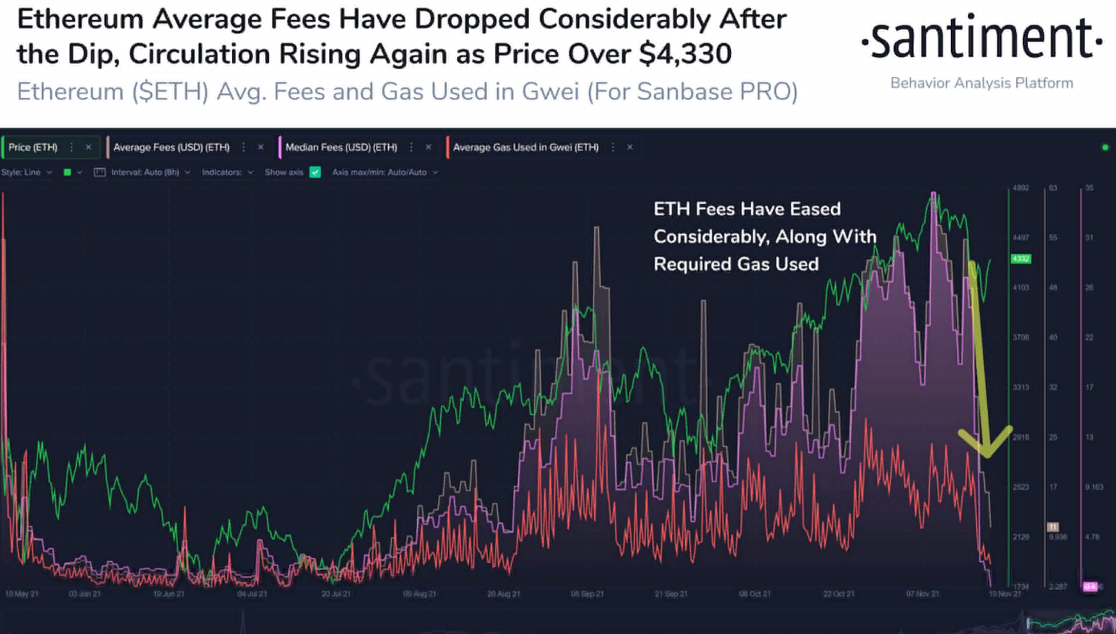 В минувшую пятницу, 19 ноября, цена ETH упала до $4000, и многие наблюдали ожидали более глубокого отката. Однако в этом же районе поддержка усилилась, и альткоин смог отскочить. В ночь на понедельник, 22 ноября, эфир торгуется на уровне $4352, его капитализация сейчас составляет чуть более $515,319 млрд.