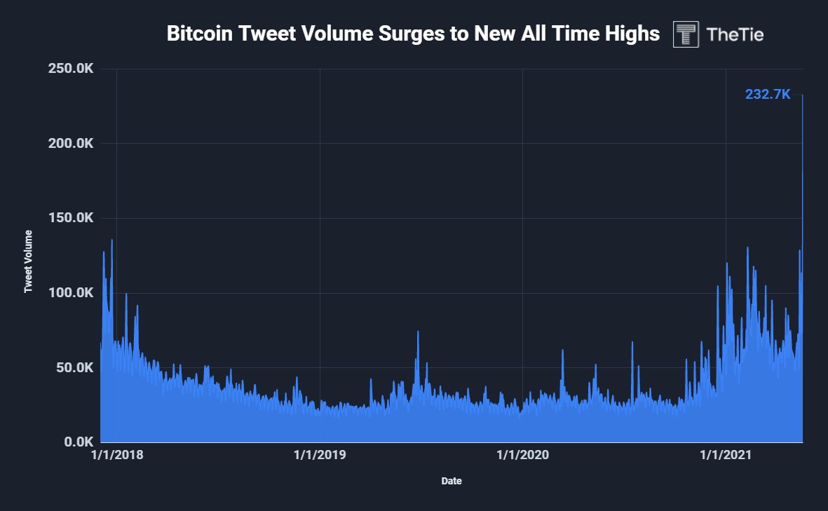 Если посмотреть на график, представленный компанией The Tie, то можно заметить, что 2021 год сначала сравнялся с 2018 годом по числу биткоин-твитов, а затем обошел его.