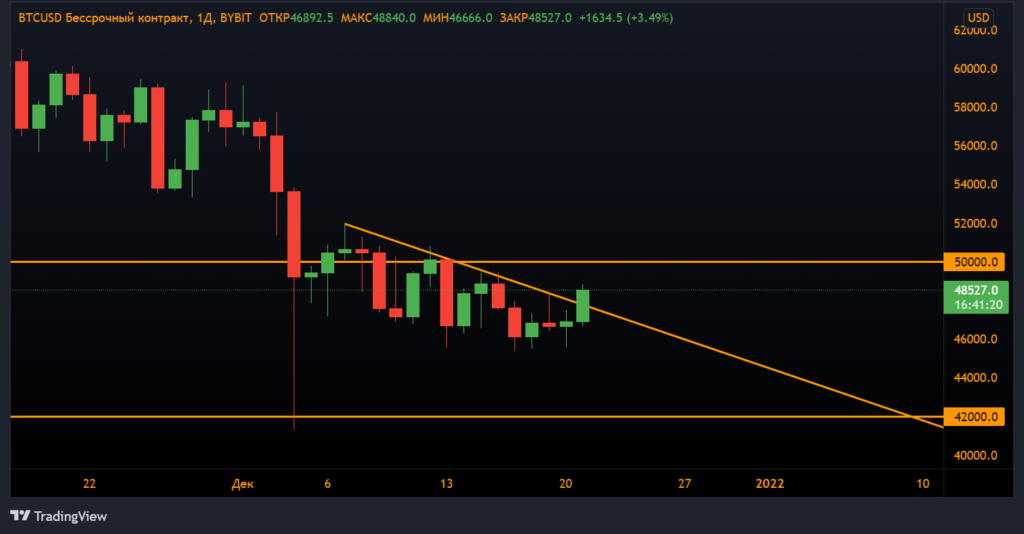7 декабря биткоин достиг $51 957, но так и не смог закрепиться выше $50 000. Затем первая криптовалюта установила несколько понижающихся локальных максимумов: 12 декабря ($50 755), 15 декабря ($49 451) и 19 декабря ($48 333).