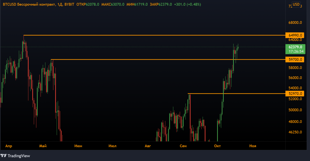 6 октября биткоин пробил уровень сопротивления $59 700. После удачного ретеста цена BTCUSD закрепилась выше $60 000 и установила локальный максимум на отметке $63 100.