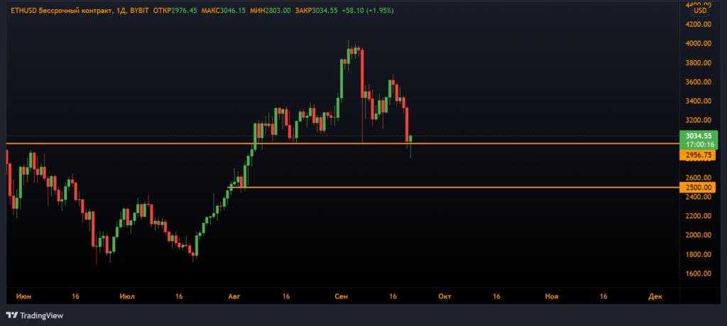 На момент публикации ETHUSD удерживает психологическую отметку в $3000. В случае ее пробития следующей важной поддержкой выступит уровень $2500.