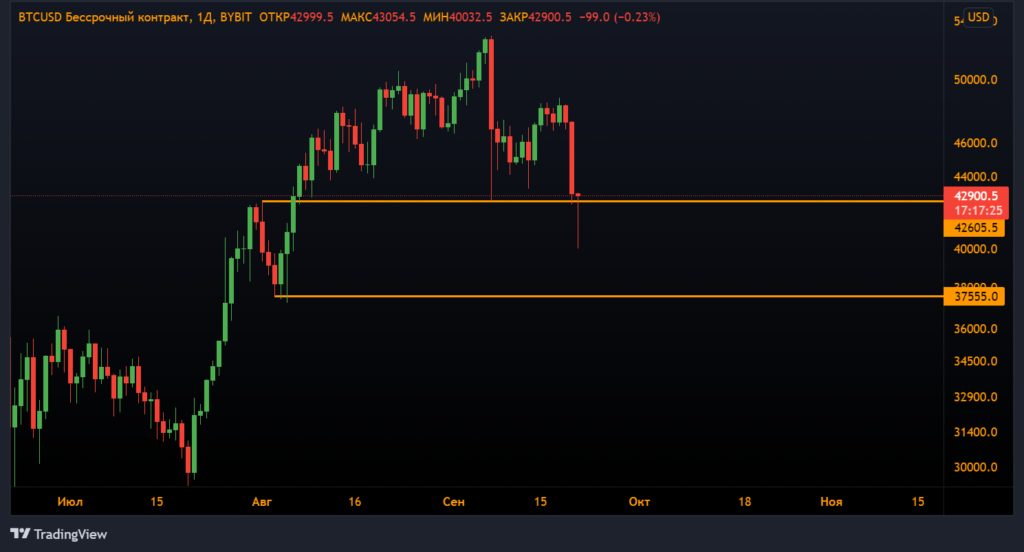 20 сентября биткоин протестировал уровень $42 600. На момент публикации материала актив торгуется около $42 900. В случае закрепления цены под этим уровнем можно ожидать снижения BTCUSD к следующей поддержке на отметке $37 500.