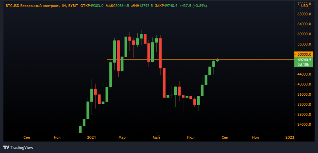 23 августа биткоин впервые с 15 мая протестировал важную психологическую отметку в $50 000. В марте-апреле этот уровень послужил поддержкой при импульсном росте биткоина с $50 600 до исторического максимума в $64 900. Пробитие $50 000 вниз ускорило падение до майского минимума $29 900.