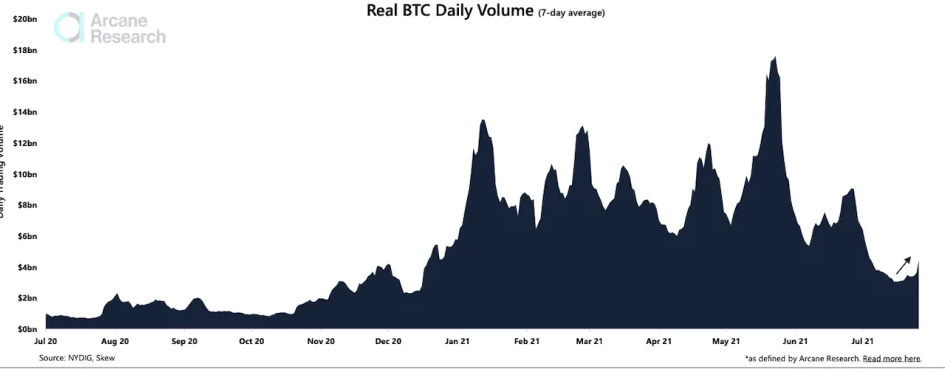 Аналитики из компании Arcane Research обратили внимание на резкое увеличение ежедневного объема торгов биткоином. Данный показатель вырос до самого высокого уровня с 22 июня после того, как BTC впервые попытался закрепиться выше $40 000.