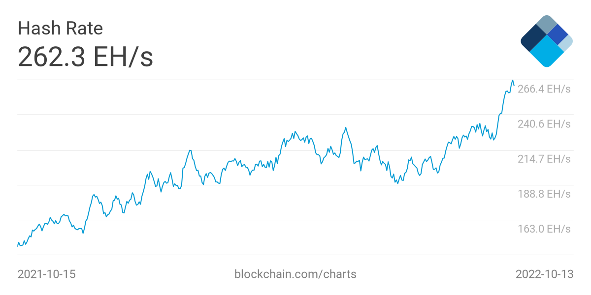 На этой неделе хешрейт BTC установил новый рекорд. Вычислительные мощности усиливаются с конца сентября. 13 октября хешрейт биткоина достиг 262,3 экзахеш в секунду (Eh/s).