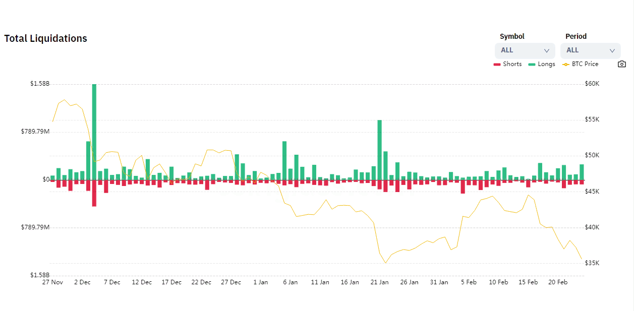 Самая большая ликвидация состоялась на платформах OKX и Binance - $151,07 млн и $133,3 млн. Были закрыты позиции 114 700 трейдеров, 87% из которых оказались долгосрочными (лонги).