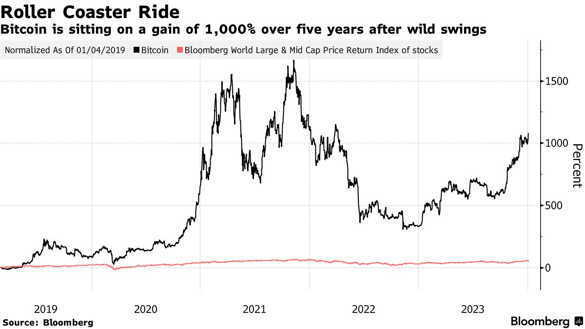 За последние 12 месяцев биткоин взлетел на 172%. Инвесторы ждут появления биржевых криптофондов ETF на американском рынке.