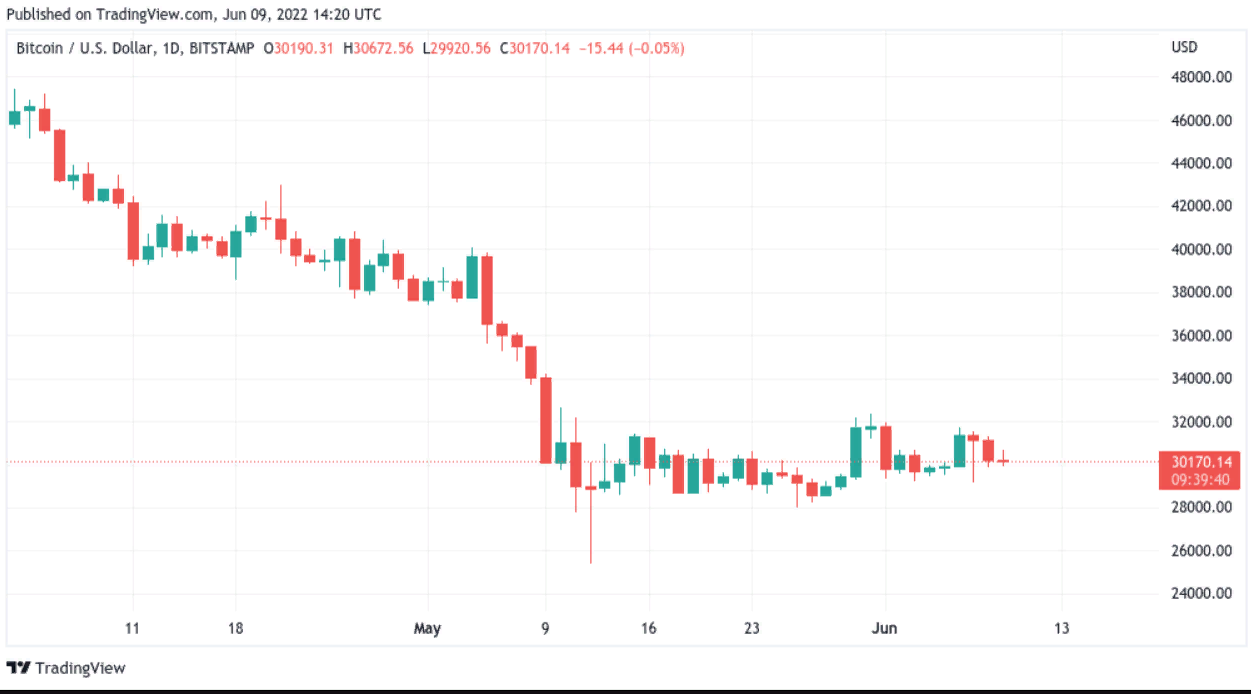 Биткоин (BTC) в пятницу, 10 июня, торгуется на отметке $30 084. Монета не удержалась выше $31 000 и может в ближайшие часы вновь просесть ниже $30 000.