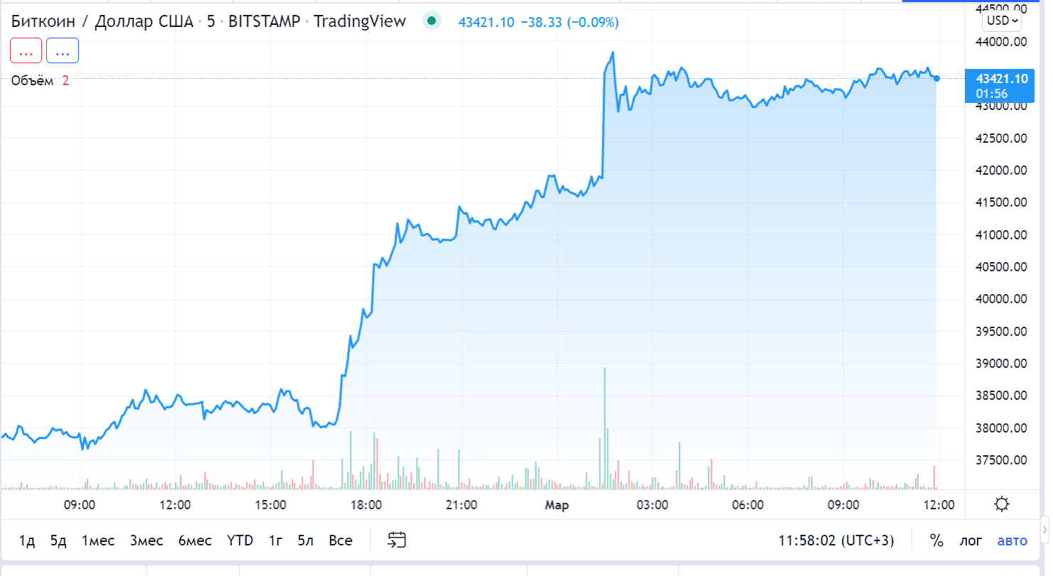 BTC уже сегодня может достичь психологической отметки в $45 000, причем наблюдатели не исключают рывка до $50 000 к концу текущей недели.