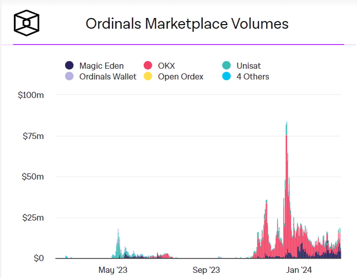 Среднесуточный объем торгов NFT на биткоине (Ordinals) составляет около $15 млн. Большинство сделок обрабатывают маркетплейсы Magic Eden и OKX.