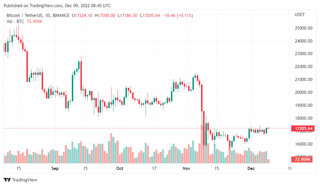 Накануне вечером биткоин (BTC) поднялся выше $17 000. В пятницу, 9 декабря, курс BTC укрепился до $17 210. Капитализация ведущей цифровой валюты на момент публикации данного обзора вплотную приблизилась к $331 млрд.
