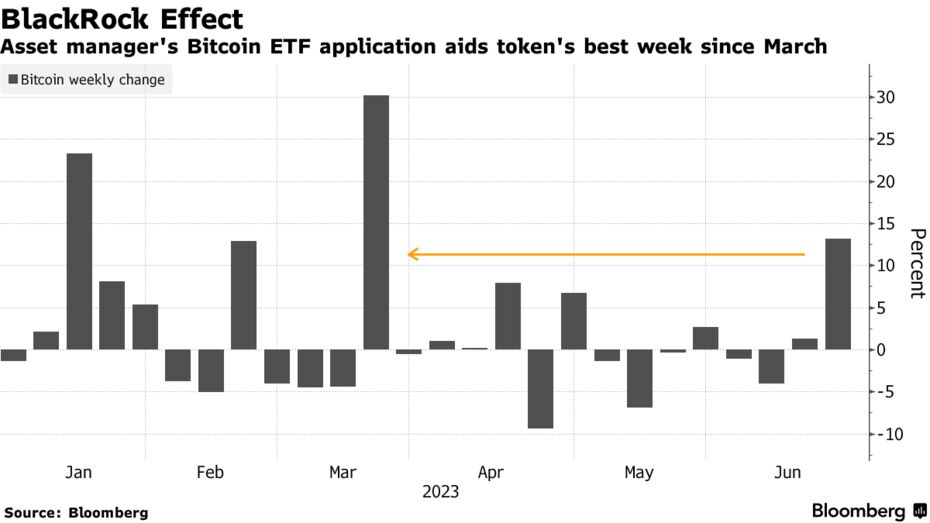 Спекуляции, подогреваемые заявкой BlackRock на запуск спотового криптофонда ETF, привели ко взлету криптовалюты выше $30 000. В пятницу, 23 июня, курс BTC скорректировался до $29 980.