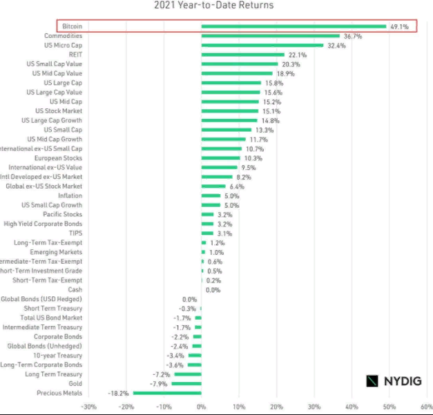 По данным инвестиционной компании NYDIG, биткоин (BTC) оказался самым результативным активом в 2021 году. Стоимость криптовалюты с января выросла почти на 50%.