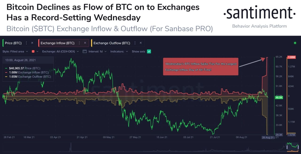 Падение, которое мы наблюдали на этой неделе, стало результатом массированного притока биткоинов на биржи. По данным Santiment, в минувшую среду на торговые площадки поступили 1,68 млн BTC – это рекордный показатель с 19 июня 2019 года.