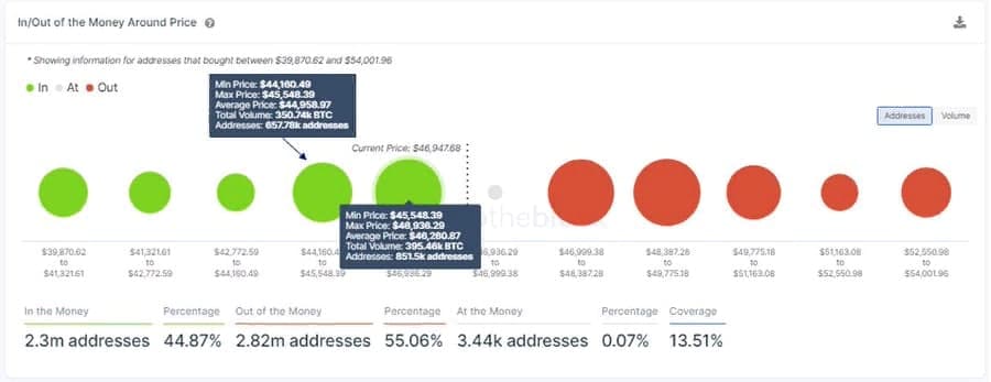 Аналитики IntoTheBlock еще сегодня утром указали на сильную зону поддержки биткоина в диапазоне от $45 500 до $46 900. По таким ценам 851 000 адресов купили в общей сложности 395 000 BTC, говорится в отчете.