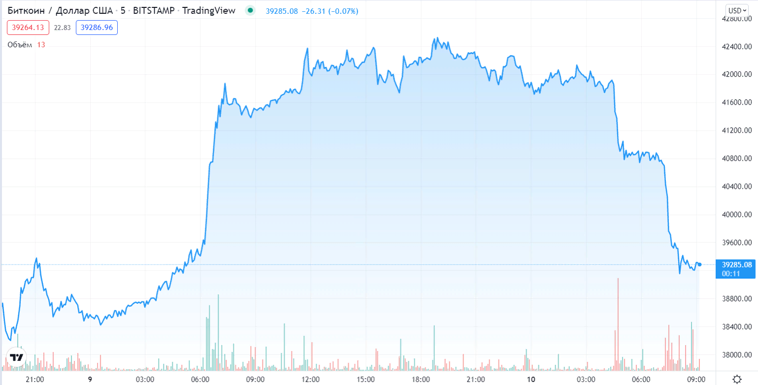 Накануне крупнейшая цифровая валюта взлетела в цене до $42 552 на бирже Bitstamp. Однако уже ночью 10 марта биткоин стал нести большие потери после того, как в конце американской сессии инвесторы перешли к продажам на спотовом рынке.