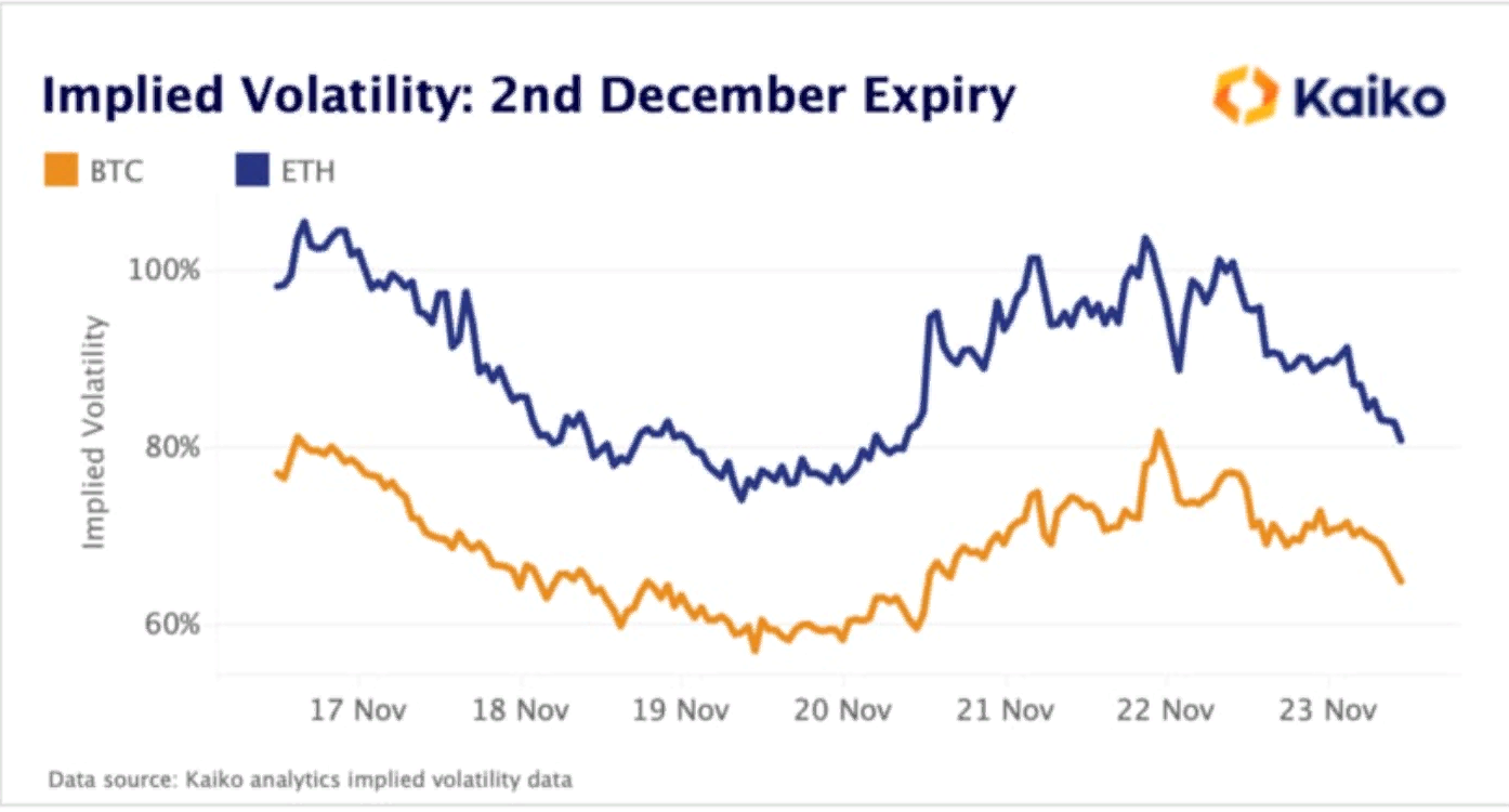 По данным Kaiko, последний всплеск волатильности наблюдался 22 ноября, когда BTC обвалился до $15 669.
