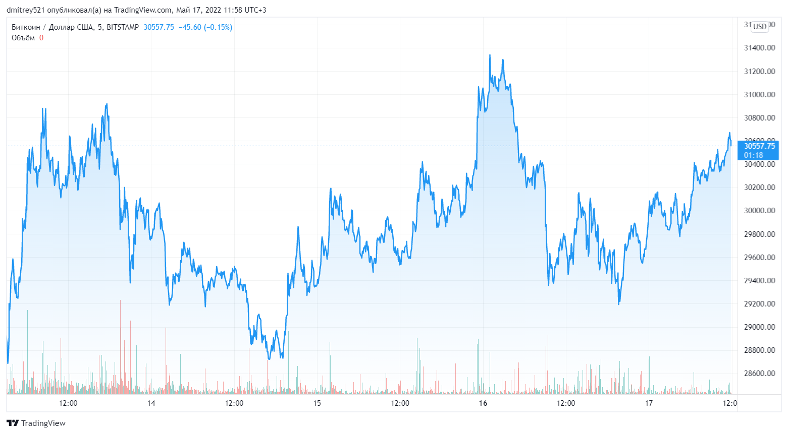 Скорее всего, торги будут проходить в узком диапазоне в ближайшие дни. Аналогичную траекторию демонстрируют с начала недели и крупнейшие цифровые валюты. Биткоин (BTC) и эфир (ETH) укрепились более чем на 2% до $30 499 и $2081 соответственно.