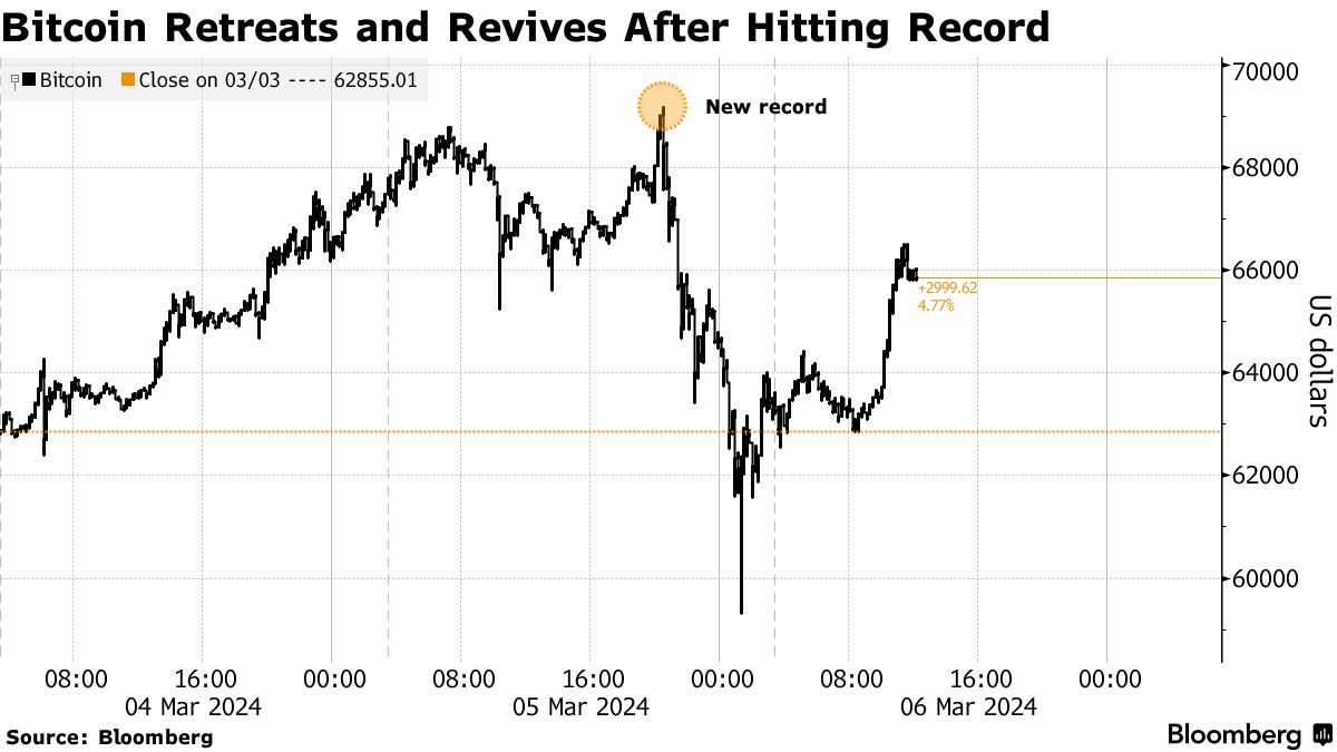В среду, 6 марта, биткоин вновь стал укрепляться. Капитал пошел на азиатские фондовые рынки, и курс BTC вырос до $66 930.