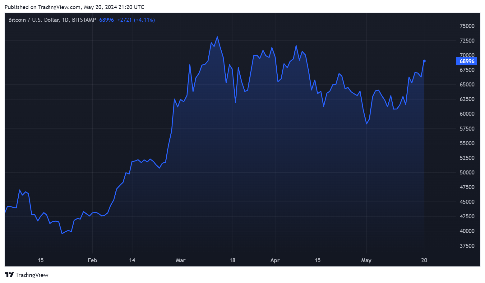 В ночь на вторник, 21 мая, курс BTC укрепился до $69 018. На некоторых биржах накануне вечером криптовалюта тестировала значения выше $70 000, но быстро скорректировалась.
