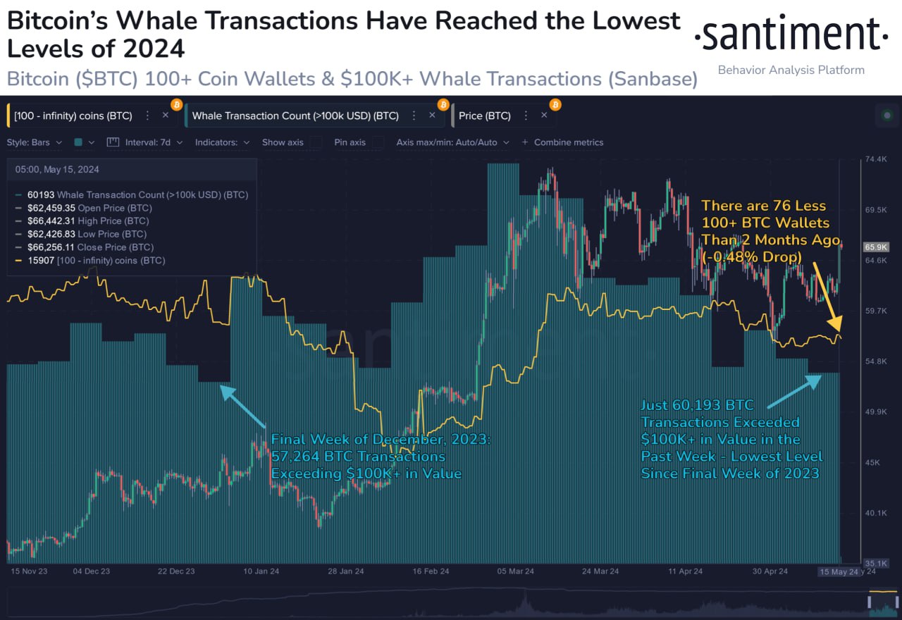 На минувшей неделе активность биткоин-китов оставалась слабой. Число транзакций на суммы не менее $100 000 оказалось на минимуме с декабря 2023 года, сообщает компания Santiment.