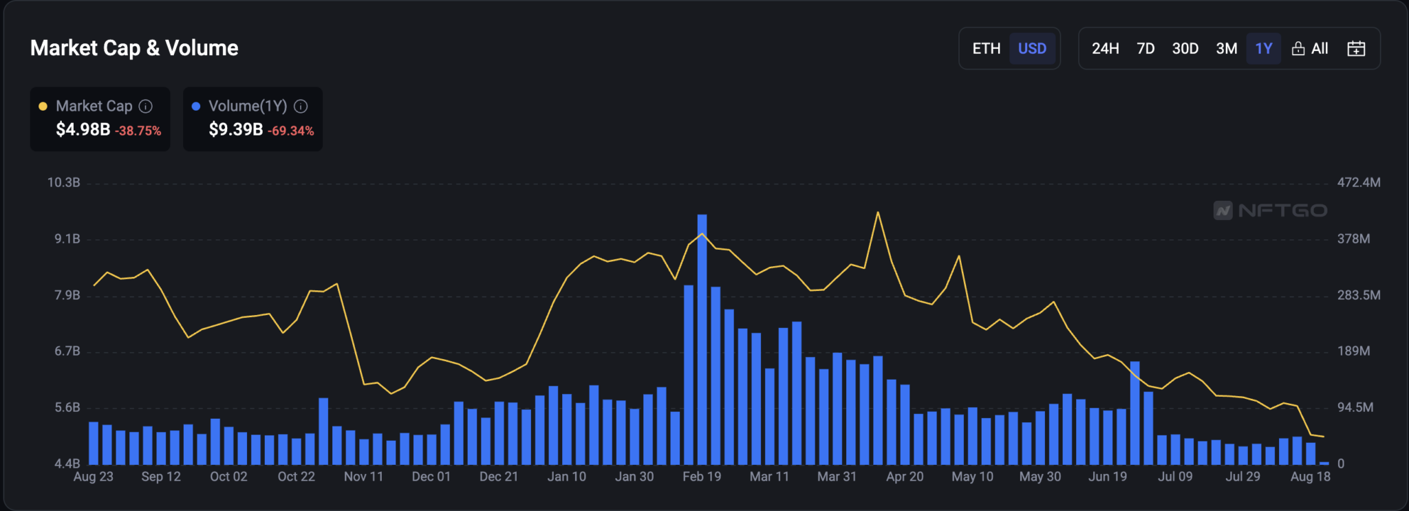 Если в середине февраля, в среднем, участники NFT-рынка совершали транзакции на сумму до $420,4 млн, то в августе оборот упал до $5 млн.