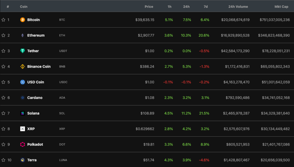 В пятницу, 4 февраля, котировки первой криптовалюты преодолели отметку $39 000. За последние сутки актив вырос на 7,4%, согласно CoinGecko.