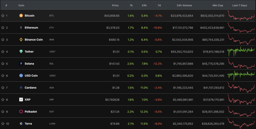 За последние сутки все цифровые активы из топ-10 по капитализации оказались в зеленой зоне. Больше других выросли Polkadot (+12,2%), Terra (+11,5%) и Cardano (+11%).