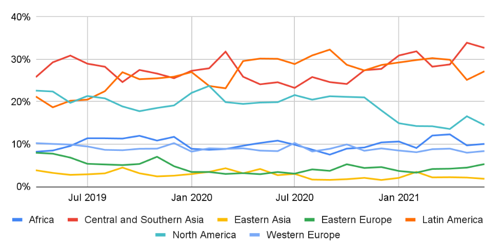 Динамика доли взвешенной на ППС на душу населения P2P-торговли по регионам. Данные: Chainalysis.