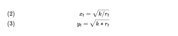 Комбинируя приведенное выше уравнение с фундаментальной формулой AMM, можно построить формулы для расчета количества каждого актива в пуле при любом заданном соотношении r в произвольный момент времени t: