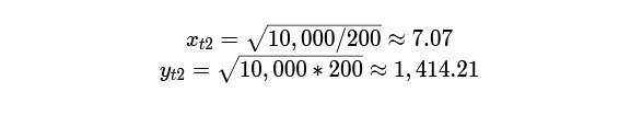 Получаем исходное состояние активов в пуле — 10 ETH и 1000 DAI. Теперь применим те же формулы в конце примера, когда 1 ETH торгуется за 200 DAI. Новое значение r равно 200. Подставим его в уравнения: