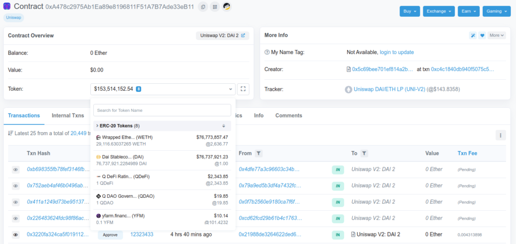 Контракт удерживал токены примерной стоимостью $153,5 млн — 29 116,6 WETH и 76,7 млн DAI.