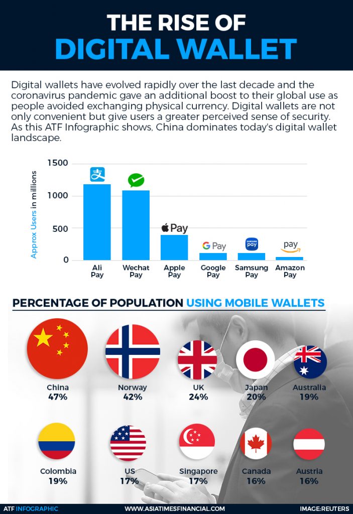 Около 2,5 млрд пользователей мобильных кошельков приходится на китайские Alipay и WeChat. Следующий за ними ApplePay не дотягивает и до 500 млн. Данные: www.asiatimesfinancial.com.