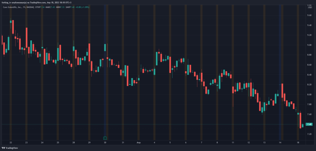 В январе 2022 года Core Scientific стала публичной компанией через обратное слияние со SPAC. Ее акции обращаются на фондовой бирже Nasdaq под тикером CORZ. На момент написания ценные бумаги торгуются вблизи $7,4 — с открытия сессии котировки потеряли почти 4%.