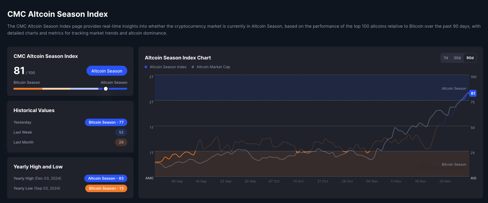 Загадочный пост CZ «Alt» намекает на сезон альткоинов, при этом индекс ASI на уровне 81 указывает на растущую доминацию альткоинов. Лидерами являются: