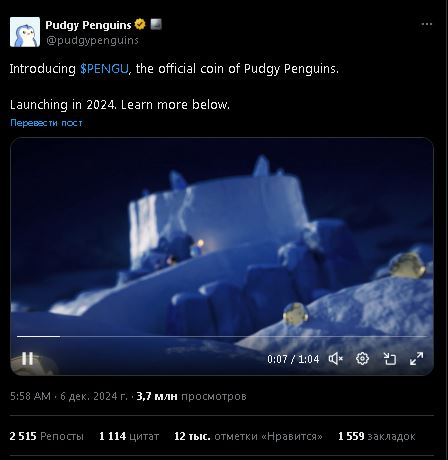 NFT-проект собирается выпустить PENGU до конца этого года, о чем заявил в соцсети Х.