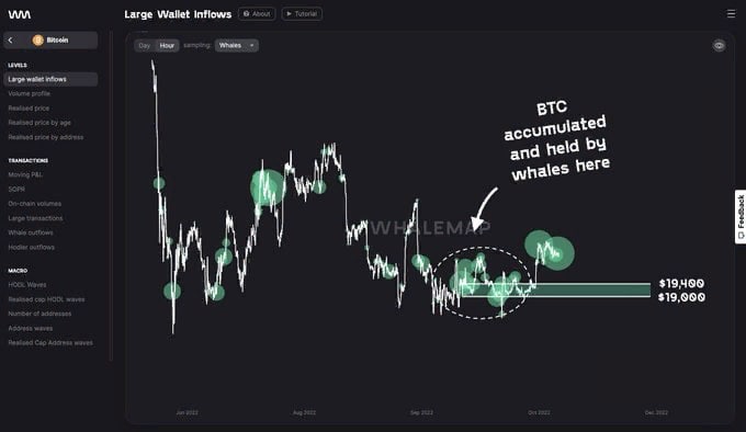 Аналитики WhaleMap указывают на сильную зону поддержки биткоина, которая сформировалась в диапазоне от $19 000 до $19 400.