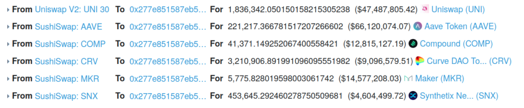 Далее злоумышленник воспользовался функцией мгновенных займов на SushiSwap и Uniswap V2. Он получил токены UNI, AAVE, COMP, CRV, MKR и SNX совокупной стоимостью $156 млн и внес их в пул DEFI5. Все эти активы являются инициализированными.